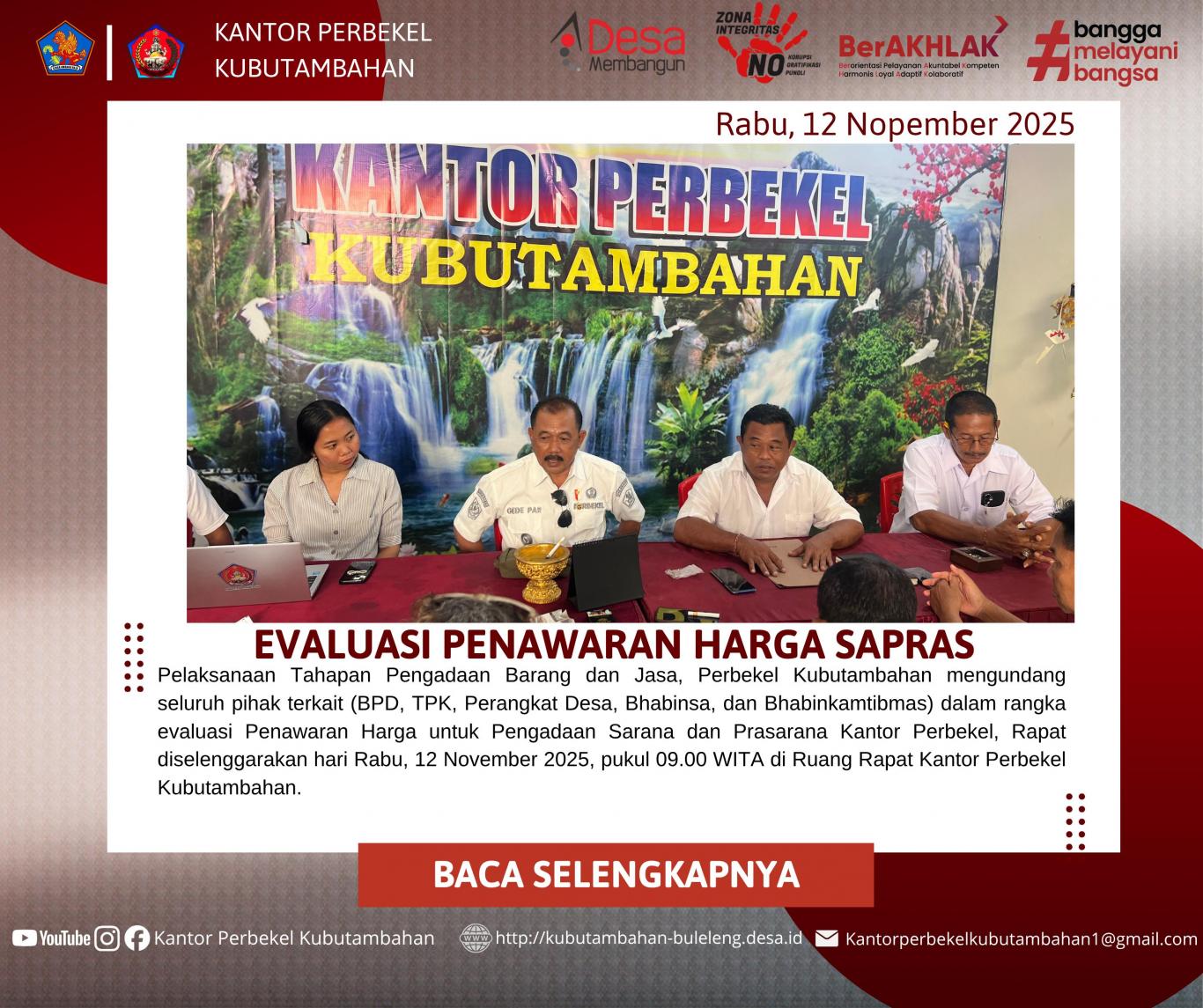 Kubutambahan, 12 November 2025 – Pemerintah Desa Kubutambahan, Kecamatan Kubutambahan, Kabupaten Buleleng, telah sukses menyelenggarakan tahapan krusial dalam proses pengadaan barang dan jasa, yakni Evaluasi Penawaran Harga. Kegiatan ini dilaksanakan dalam rangka persiapan pengadaan sarana prasarana untuk proyek strategis Pembangunan Rehabilitasi/Peningkatan Gedung Kantor Perbekel Desa Kubutambahan.