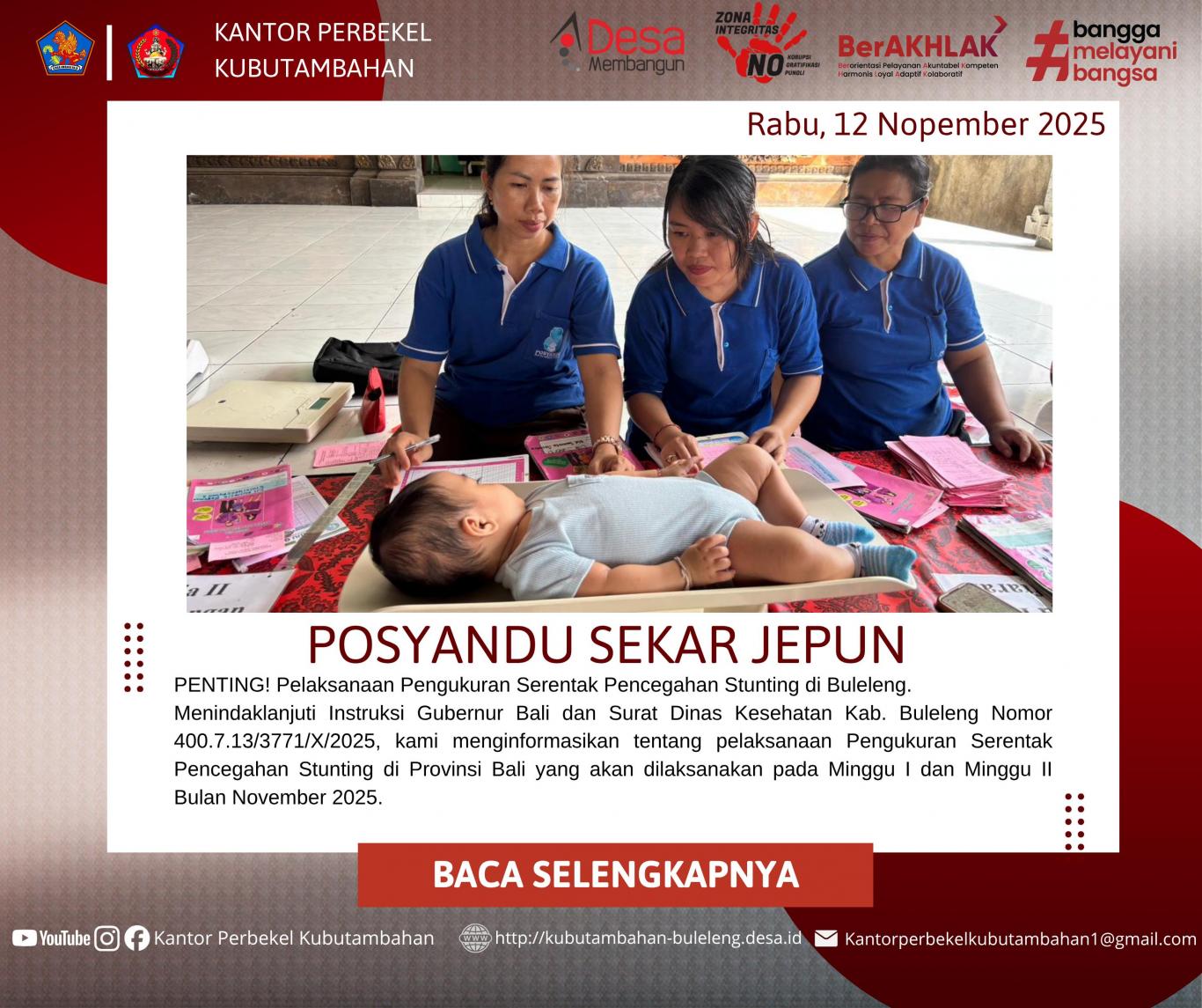 Kubutambahan, 12 November 2025 – Dalam upaya mewujudkan masyarakat yang sehat dan berkualitas di setiap tahapan usia, Posyandu Sekar Jepun di Desa Kubutambahan hari ini, Rabu (12/11), menggelar kegiatan rutin Posyandu Siklus Kehidupan (PSK). Kegiatan ini bukan sekadar Posyandu Balita biasa, melainkan sebuah layanan kesehatan terpadu yang merangkul seluruh warga desa, mulai dari janin dalam kandungan hingga lanjut usia (Lansia). Serta yang terpenting adalah Mencegah terjadinya Stunting pada tumbuh kembang anak.