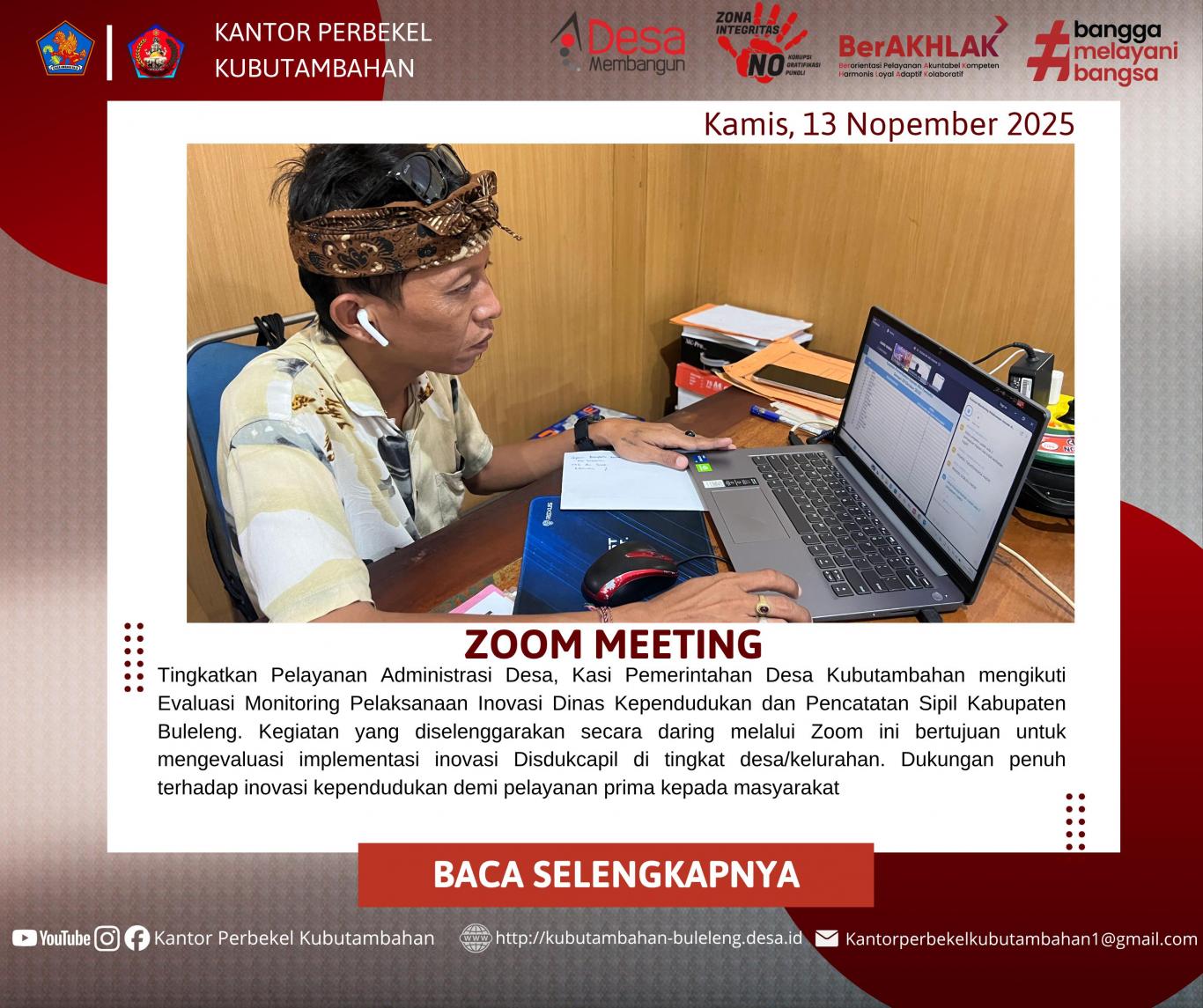 Kegiatan yang diselenggarakan secara daring (Zoom Meeting) ini dimulai sejak pukul 08.00 WITA. Undangan ini ditujukan kepada Perbekel/Lurah se-Kabupaten Buleleng, yang dalam hal ini diwakilkan oleh Kasi Pemerintahan Desa Kubutambahan.