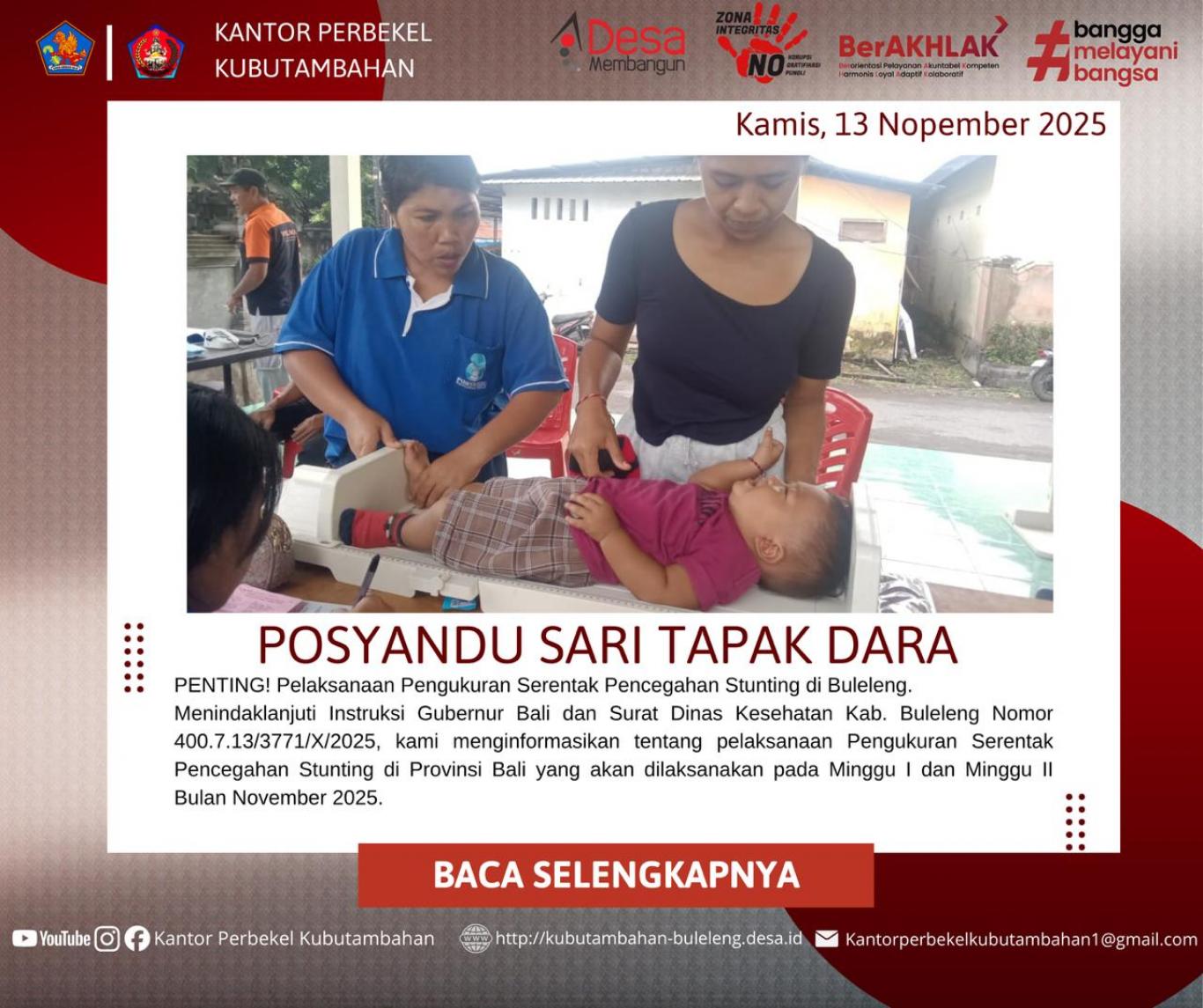 Melalui kegiatan Posyandu Siklus Kehidupan ini, Desa Kubutambahan terus berupaya memastikan bahwa setiap warganya mendapatkan hak dasar kesehatan yang layak dan terjangkau, menegaskan peran Posyandu sebagai pilar utama pembangunan kesehatan di tingkat komunitas.