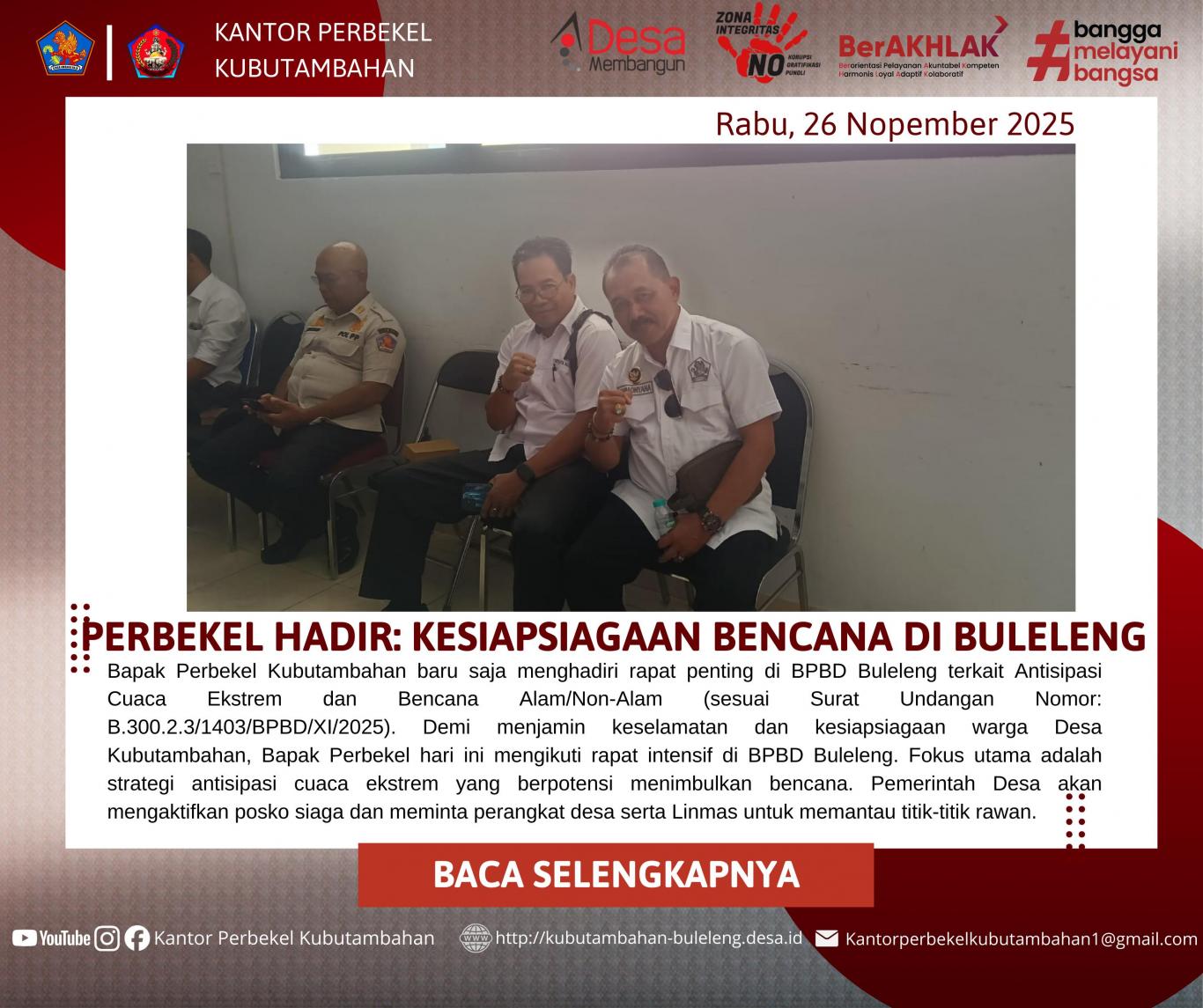 Buleleng, [26 November 2025] – Dalam upaya meningkatkan kesiapsiagaan dan mitigasi terhadap potensi bencana, Perbekel Kubutambahan telah menghadiri Rapat Kesiapsiagaan Bencana yang diselenggarakan oleh Badan Penanggulangan Bencana Daerah (BPBD) Kabupaten Buleleng.