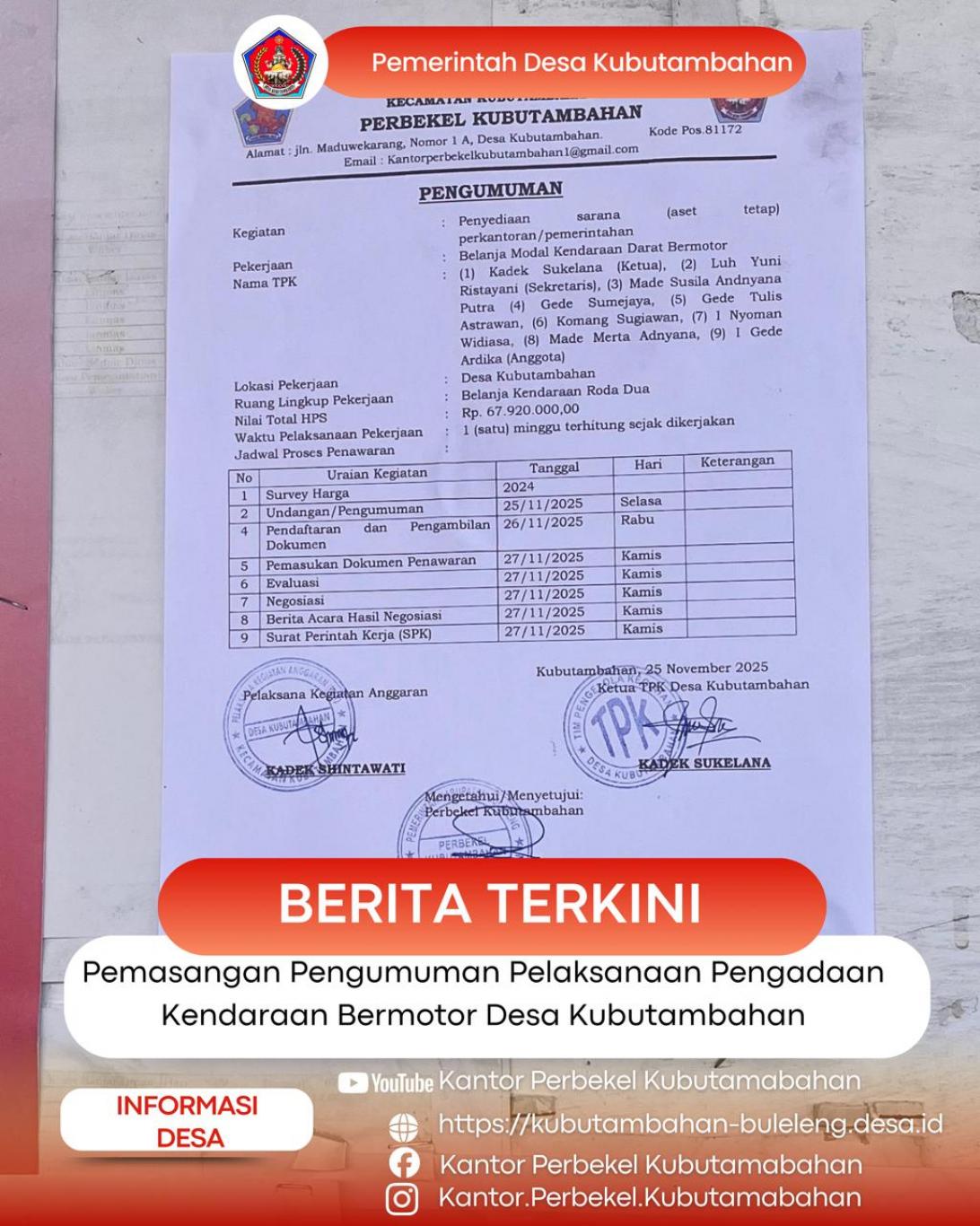 Hari ini, [Rabu, 26 November 2025], Pelaksana Kegiatan Anggaran (PKA) dan Tim Pelaksana Kegiatan (TPK) Desa Kubutambahan melaksanakan salah satu tahapan penting dalam proses pengadaan barang dan jasa di desa, yaitu Pasang lembar "PENGUMUMAN RESMI PELAKSANAAN PENGADAAN BARANG: Belanja Modal Kendaraan Darat Bermotor Desa Kubutambahan" ini dengan rapi di Papan Pengumuman Utama Kantor Desa. Pastikan pengumuman terpasang dengan kuat, mudah dilihat, dan mudah dibaca oleh masyarakat umum, terutama para calon penyedia. Catat tanggal pemasangan dan segera laporkan kepada Ketua TPK/Sekretaris TPK bahwa pengumuman telah terpasang sebagai bagian dari dokumentasi kegiatan. Jaga agar pengumuman tetap utuh selama masa tayang (sesuai jadwal yang tertera di dalam pengumuman).