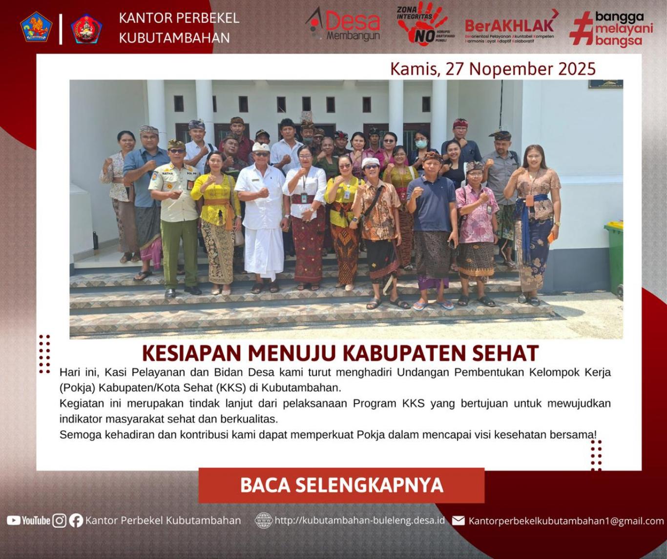 Kubutambahan, 27 November 2025 – Dalam upaya mencapai target dan indikator yang ditetapkan dalam Program Kabupaten/Kota Sehat (KKS), Pemerintah Kec.Kubutambahan menggelar Sosialisasi dan Koordinasi Pembentukan Kelompok Kerja (Pokja) KKS tingkat Desa. Kegiatan ini dilaksanakan pada hari Kamis, 27 November 2025, bertempat di Ruang Rapat Kantor Perbekel Bukti.