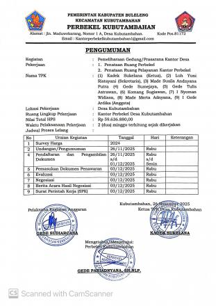 Dalam rangka melaksanakan Anggaran Pendapatan dan Belanja Desa (APBDes) Tahun Anggaran 2025 untuk Pemeliharaan Gedung Kantor Perbekel pada Pekerjaan Penataan Ruang Perbekel dan Ruang Pelayanan Kantor Perbekel Kubutambahan. Dengan ini Pelaksana Kegiatan Anggaran (PKA) dan Tim Pelaksana Kegiatan (TPK) Desa Kubutambahan mengumumkan dan mengundang secara terbuka kepada seluruh Penyedia Barang/Jasa yang berminat dan memenuhi persyaratan untuk mengikuti proses penawaran pengadaan barang, sebagai berikut di foto: