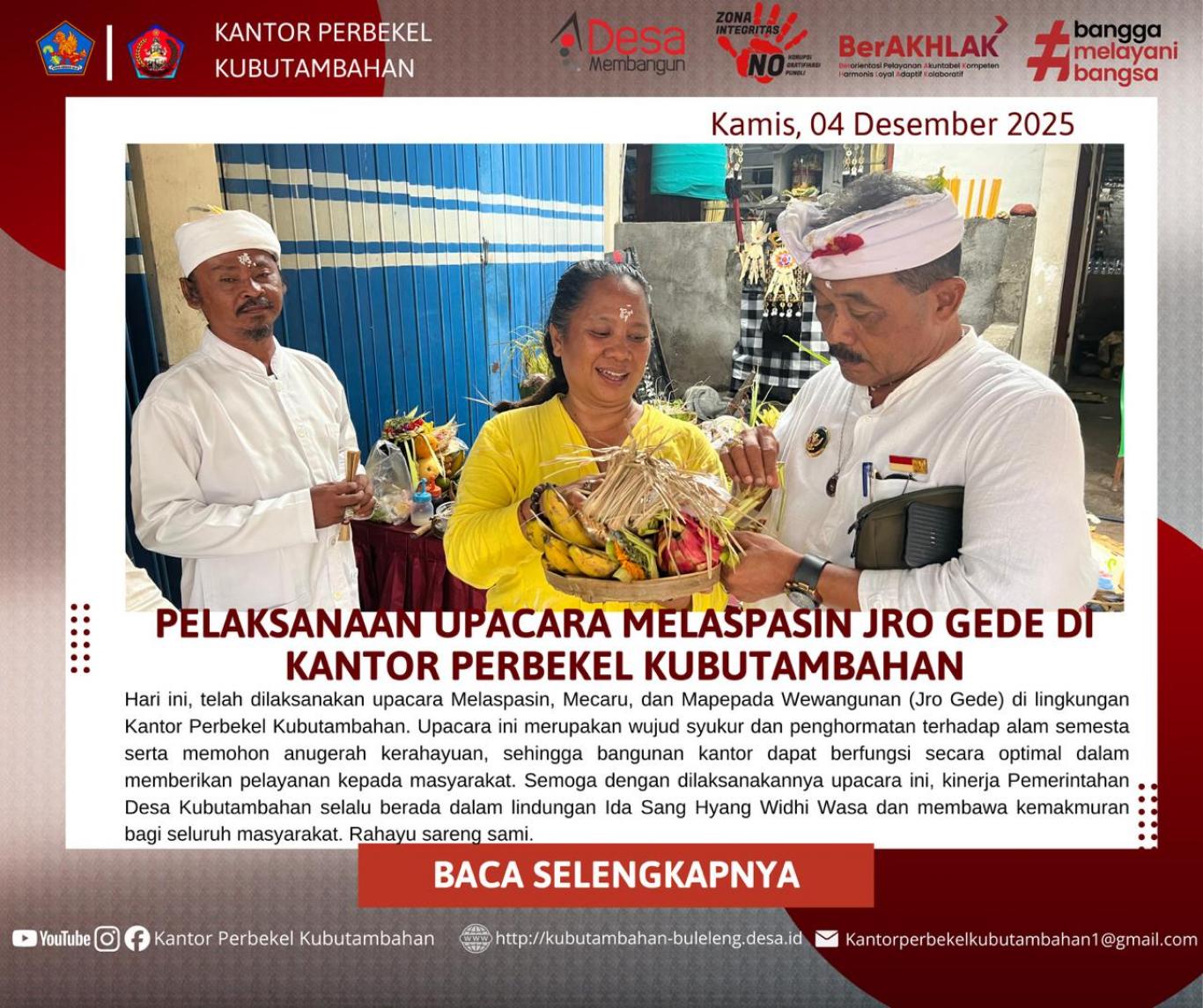 KUBUTAMBAHAN - Suasana khidmat menyelimuti Kantor Perbekel Kubutambahan pada hari Kamis, 4 Desember 2025. Seluruh komponen pemerintahan desa dan masyarakat adat bersatu padu melaksanakan upacara suci Melaspasin Jro Gede (palinggih Ratu Gede) di areal kantor perbekel. Pelaksanaan ritual ini bertepatan dengan momen baik yaitu Purnama Keenam (Sasih Keenam/Kanem), yang secara astronomi juga ditandai dengan fenomena alam Cold Supermoon atau Bulan Purnama terbesar terakhir di penghujung tahun 2025.