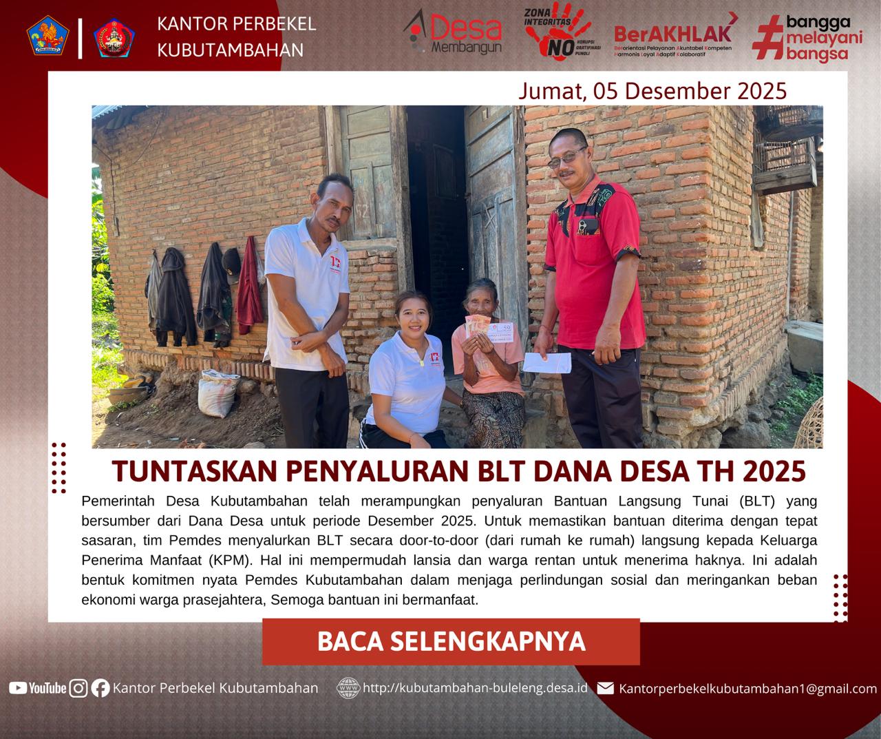Kubutambahan, 5 Desember 2025 – Pemerintah Desa Kubutambahan, Kecamatan Kubutambahan, Kabupaten Buleleng, telah menuntaskan komitmennya dalam pengentasan kemiskinan ekstrem melalui penyaluran Bantuan Langsung Tunai Dana Desa (BLT DD) periode terakhir tahun anggaran 2025, yaitu alokasi bulan Desember.