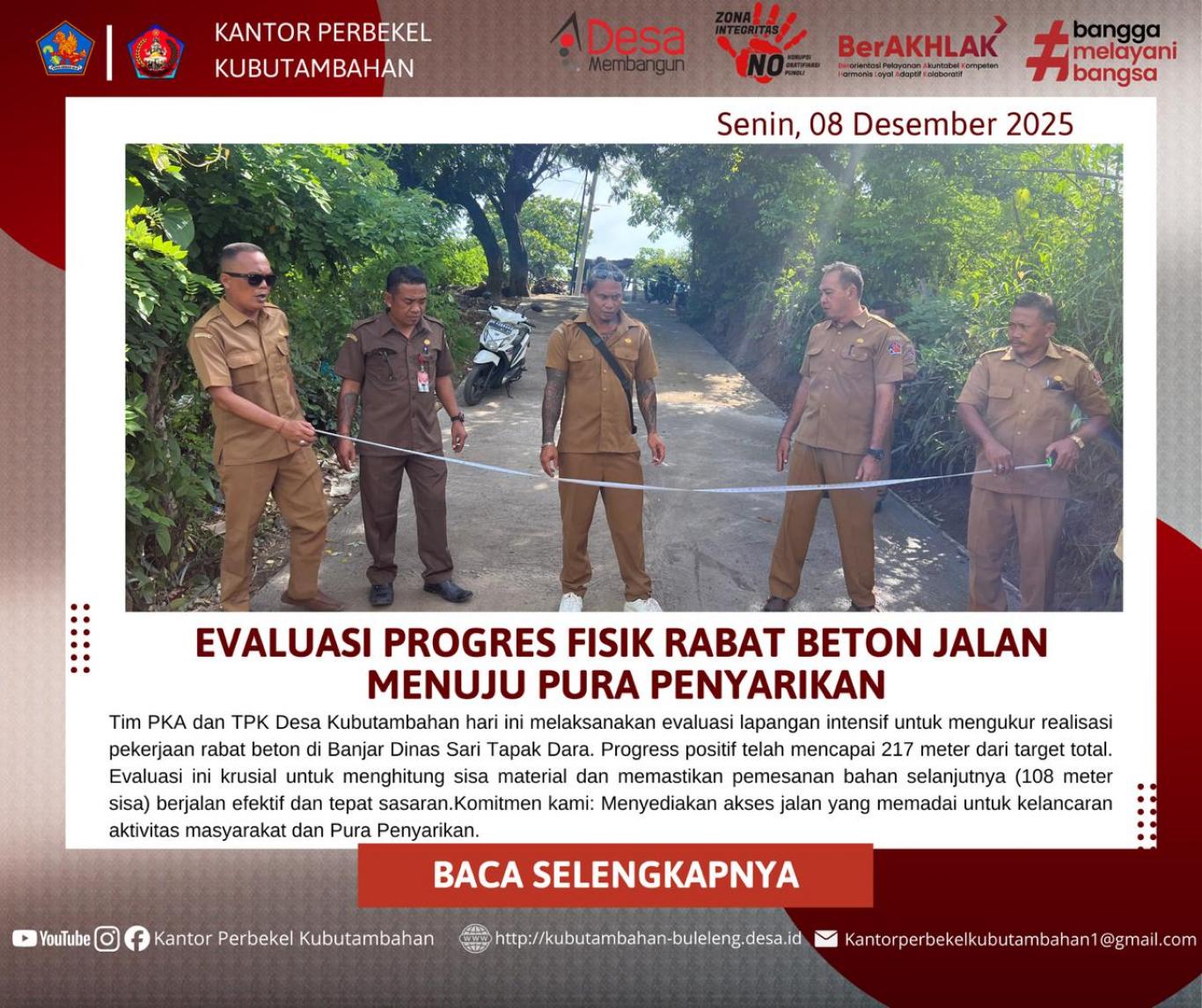 Pada hari [Tanggal Pelaksanaan Evaluasi, misalnya: Kamis, 8 Desember 2025], telah dilaksanakan kegiatan evaluasi lapangan terhadap progress fisik pekerjaan Rabat Beton Jalan Menuju Pura Penyarikan di wilayah Banjar Dinas Sari Tapak Dara, Desa Kubutambahan.