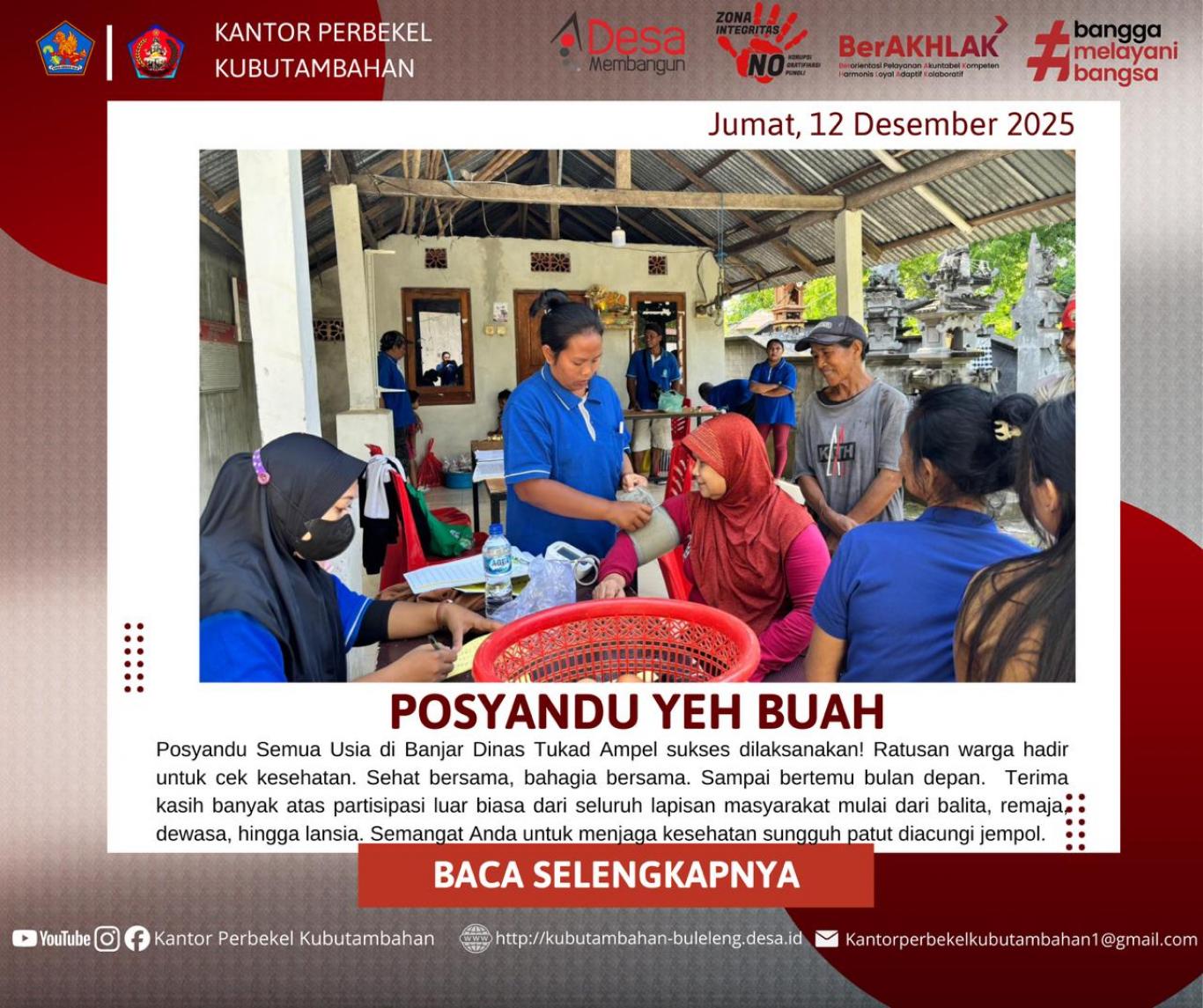 Kubutambahan, 12 Desember 2025 – Pos Pelayanan Terpadu (Posyandu) Yeh Buah di Desa Kubutambahan sukses menyelenggarakan kegiatan rutinnya pada hari Jumat, 12 Desember 2025. Posyandu ini kembali menunjukkan perannya sebagai garda terdepan dalam upaya kesehatan berbasis masyarakat, dengan melibatkan partisipasi aktif dari seluruh komponen warga, mulai dari bayi, balita, remaja, ibu hamil, hingga lanjut usia (lansia).