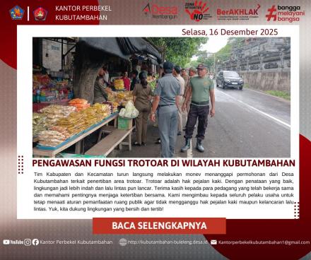 **Kubutambahan, 16 Desember 2025** – Satuan Polisi Pamong Praja (Satpol PP) Kabupaten bersama Satpol PP tingkat Kecamatan hari ini, Selasa (16/12), melaksanakan kegiatan pengawasan dan penertiban fungsi trotoar di wilayah Desa Kubutambahan.