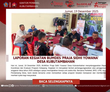 KUBUTAMBAHAN – Pada hari Jumat, 19 Desember 2025, bertempat di Aula Kantor Desa Kubutambahan, telah dilaksanakan rapat koordinasi terkait Laporan dan Evaluasi Penyertaan Modal Tahun Anggaran 2025. Fokus utama pertemuan ini adalah meninjau perkembangan Program Ketahanan Pangan Ayam Petelur yang dikelola oleh BUMDes Praja Sidhi Yowana.