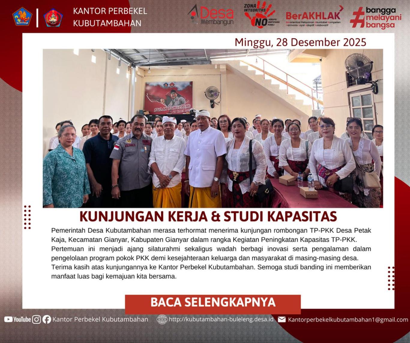 KUBUTAMBAHAN – Dalam upaya meningkatkan kualitas sumber daya manusia dan efektivitas program kerja, Tim Penggerak Pemberdayaan Kesejahteraan Keluarga (TP-PKK) Desa Petak Kaja, Kecamatan Gianyar, melakukan kunjungan kerja dalam rangka Peningkatan Kapasitas ke Desa Kubutambahan, Kabupaten Buleleng, pada Minggu (28/12/2025).