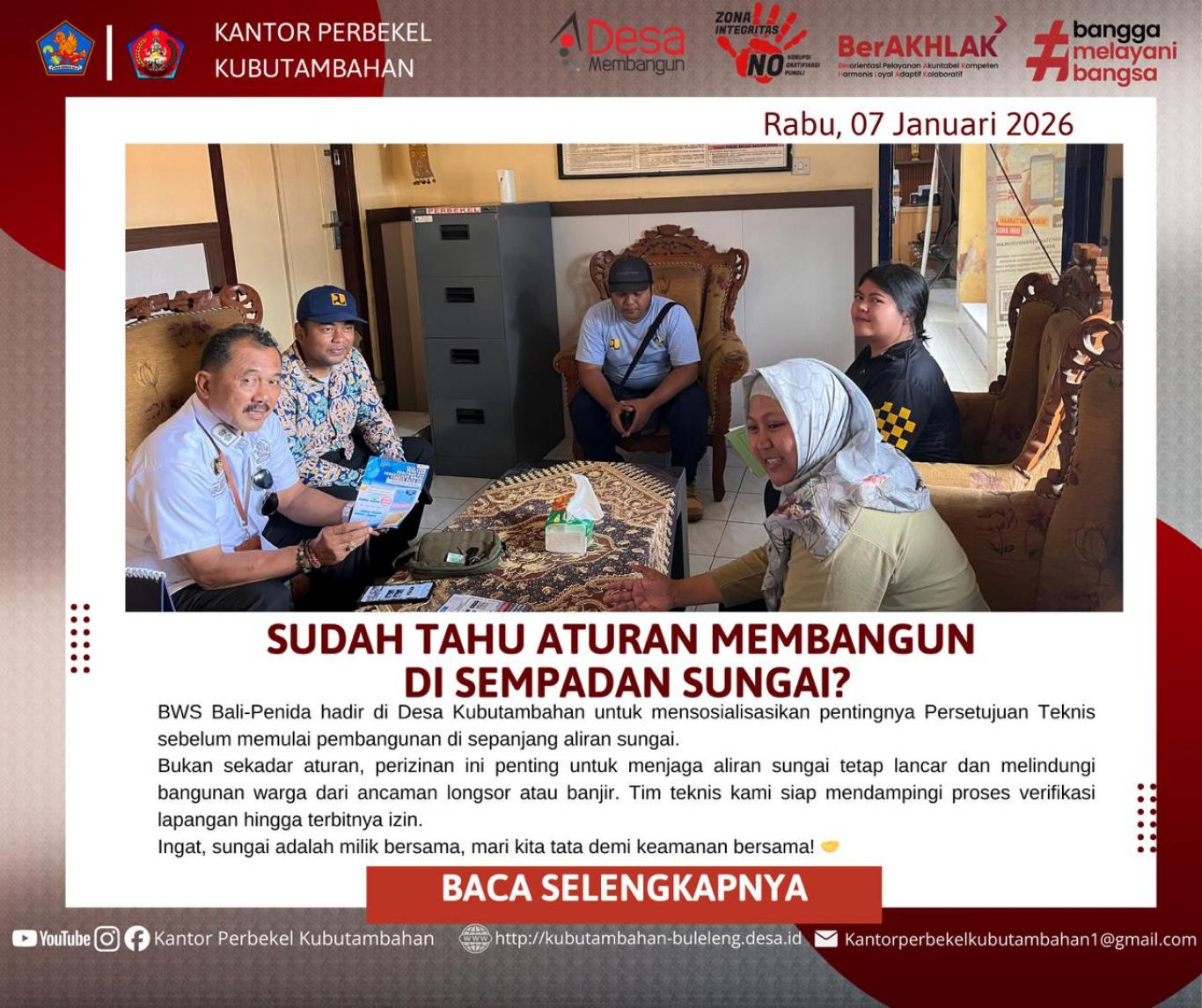 Diskusi interaktif yang berlangsung di ruangan kantor perbekel ini diharapkan mampu meminimalisir pelanggaran tata ruang di sepanjang sungai di wilayah Kubutambahan. BWS Bali-Penida berkomitmen untuk terus mendampingi pihak desa dalam memberikan edukasi kepada warga agar setiap pembangunan selaras dengan upaya pelestarian sumber daya air.