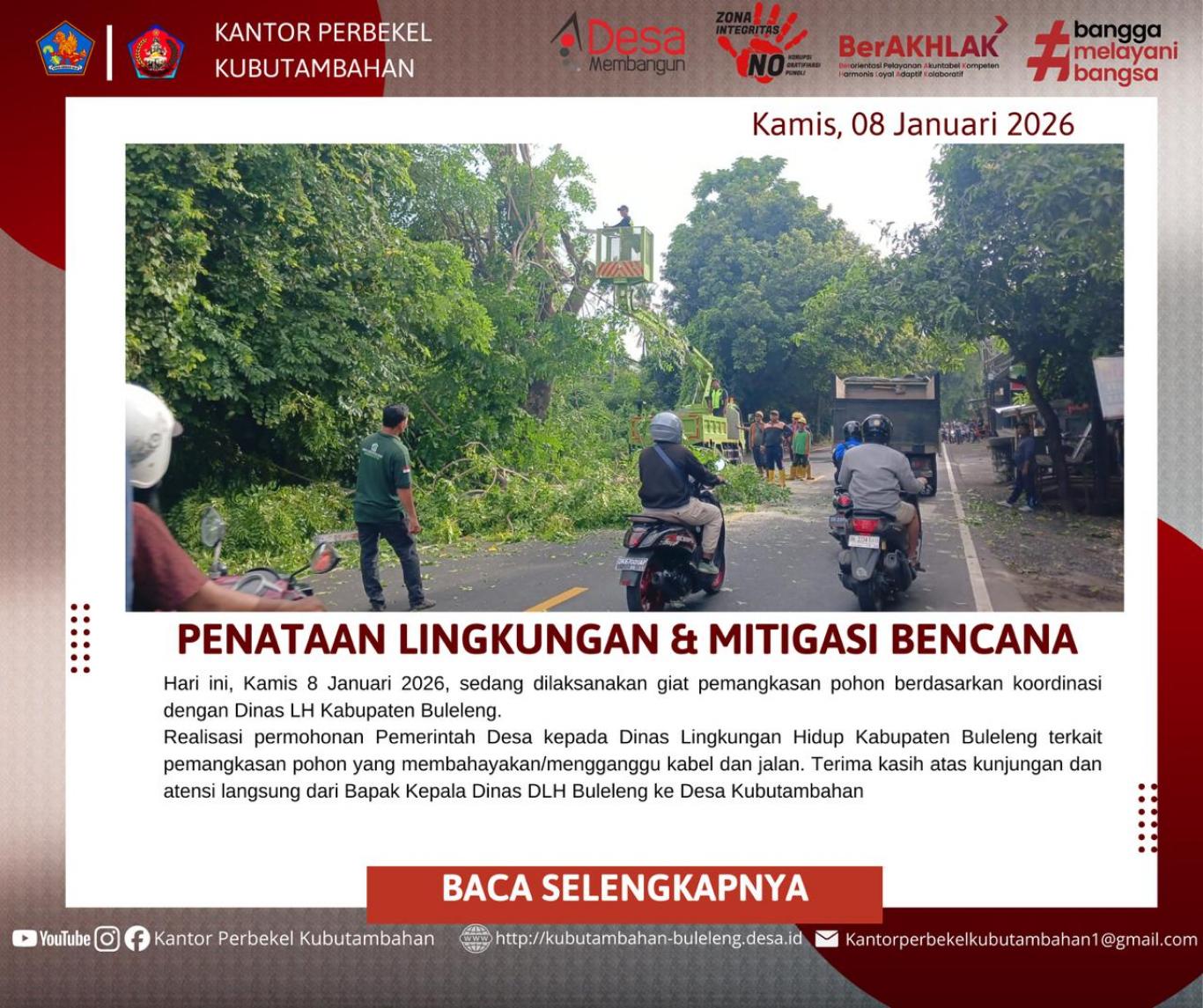 Kegiatan ini bukan sekadar pemeliharaan rutin, melainkan merupakan tindak lanjut cepat dari hasil kunjungan kerja Kepala Dinas Lingkungan Hidup (DLH) Kabupaten Buleleng ke Kantor Perbekel Kubutambahan yang dilaksanakan pada tanggal 6 Januari lalu. Dalam pertemuan tersebut, telah disepakati perlunya penanganan segera terhadap pohon-pohon yang dinilai rawan tumbang atau mengganggu kabel jaringan listrik.