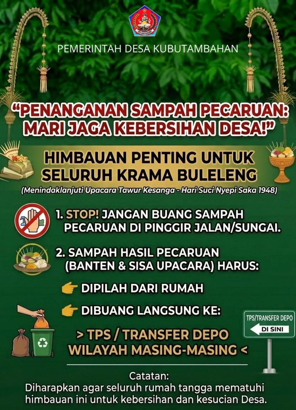 17 November 2025 11:44:05 WITA Luh Yuni RistayaniKUBUTAMBAHAN, 17 November 2025 – Pemerintah Desa (Pemdes) Kubutambahan, Kabupaten Buleleng, dengan penuh suka cita menyampaikan Selamat Hari Raya Suci Galungan yang jatuh pada hari Rabu, 19 November 2025, dan Hari Raya Suci Kuningan yang akan dirayakan sepuluh hari setelahnya, pada hari Sabtu,... ..selengkapnya